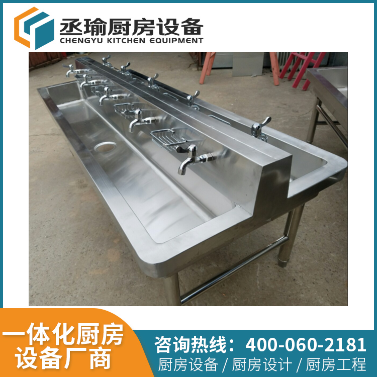 外形尺寸:mm,水槽深度:250mm,水槽為通槽,長度:1400mm,擋水板邊緣台麵100mm,外端邊緣100mm,兩端寬處台麵200mm,水池底部帶有不鏽鋼加強筋加固。四條水池腿采用直徑38x1.2不鏽鋼管,並帶有不鏽鋼可調節腳,調節高度:20mm。設置5個肥皂盒(可做成洗手液瓶放置框),5個不鏽鋼水,水可根據需要設置成單冷水或者是冷熱水,上水管采用不鏽鋼金屬軟管,一個總下水口,下水器為全不鏽鋼,帶有橡膠墊片,保證不漏水,下水管用50mmPVC管連接。