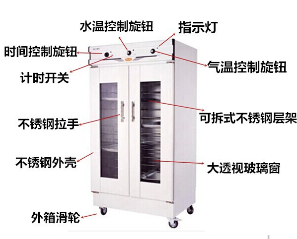 麵包發酵箱是根據麵包發酵原理和要求而進行設計的電熱產品。它是利用電熱管,通過控製電路,使用發酵箱內產生相對濕度為80-85%,溫度為36℃-38℃是最適合麵包發酵之環境,幫助造型後的麵包坯完成後發酵過程。它具有結構緊湊、美觀大方、操作簡單、使用可靠等特點,是生產麵包必不可少的配套設備。